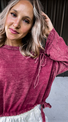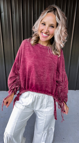 Adjustable Ties at the wrists and at the side; can tie in a single string knot or let hang.